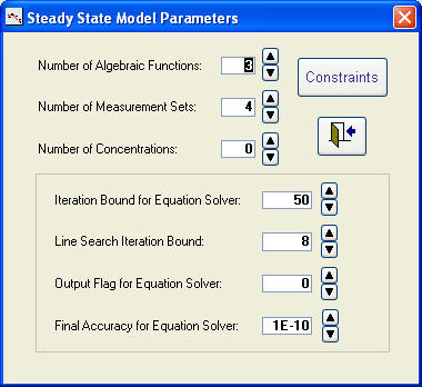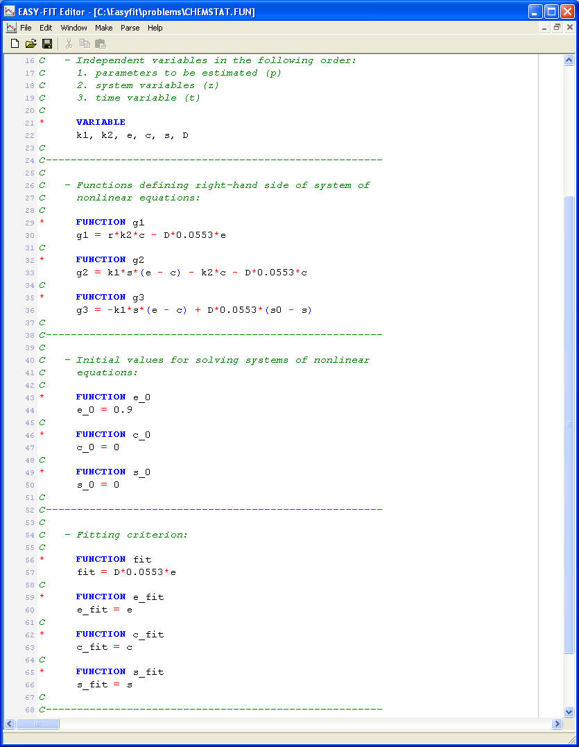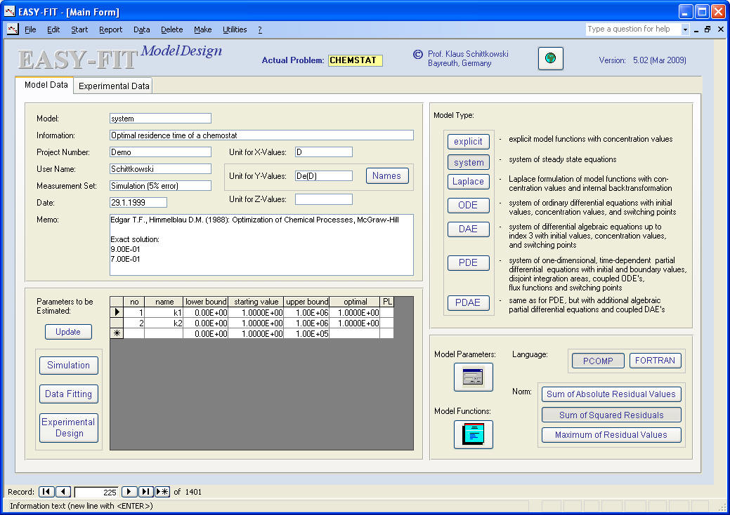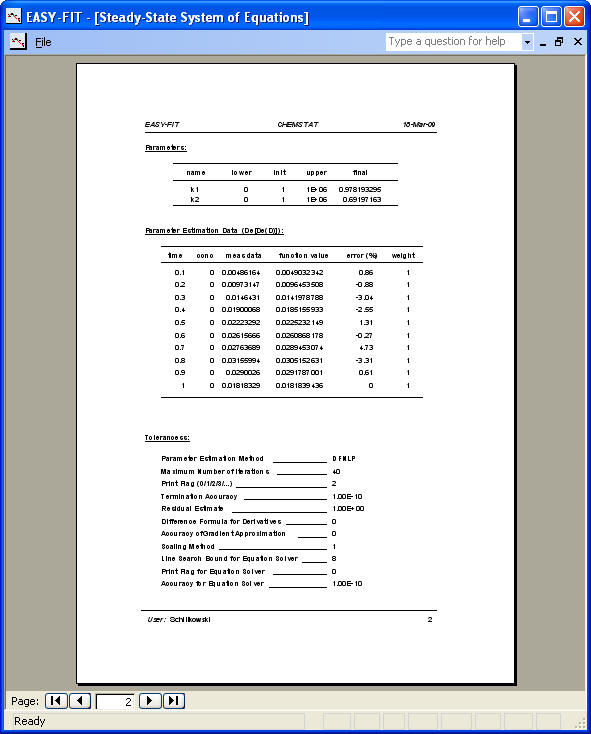e, c, and s are the state variables, i.e., the solution variables of the system of equations, depending on a concentration D for which measurements subject to the fitting criterion 0.0553 D e are generated. Parameters to be estimated, are k1 and k2.