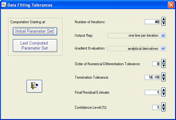 Parameters, tolerances and start of a data fitting run: