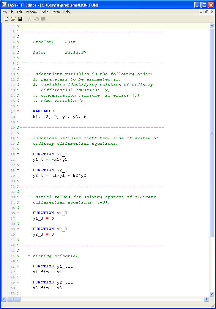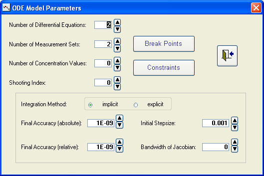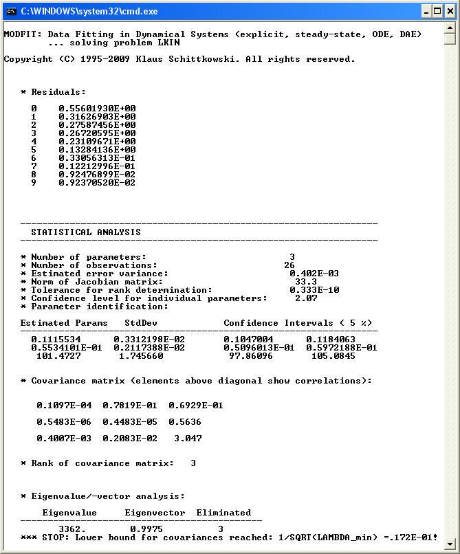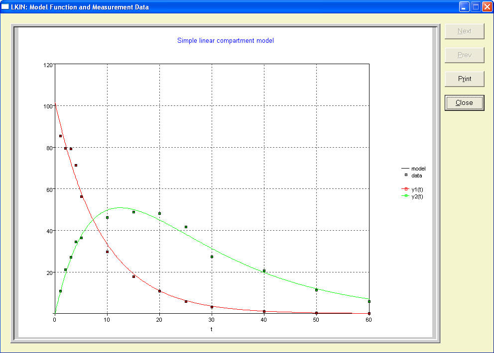 with initial values y1(0)=D, the initial dose, and y2(0)=0. Parameters to be estimated, are the rate constants ki and k2, and the dose D. Experimental data are available for y1(t) and y2(t) for 13 time values between 1 min and 60 min. The lower index t denotes the time derivative of the concentrations y1(t) and y2(t).