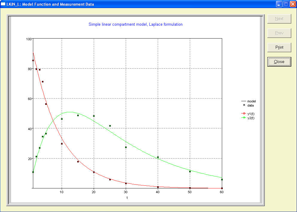 with initial values y1(0)=D, the initial dose, and y2(0)=0. Parameters to be estimated, are the rate constants ki and k2, and the dose D. Experimental data are available for y1(t) and y2(t) for 13 time values between 1 min and 60 min. The lower index t denotes the time derivative of the concentrations y1(t) and y2(t).