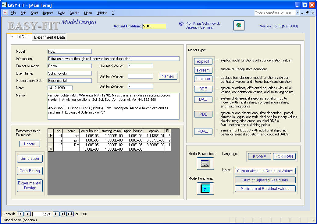 at the right boundary x=L . Cm(x,t) and Cim(x,t) are the tracer concentrations, Dm is the dispersion coefficient, and Vm the volume. Dm, pm, and pim are the unknown parameters to be estimated. Fitting criterion for which measurements are available, is