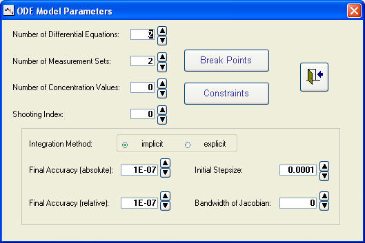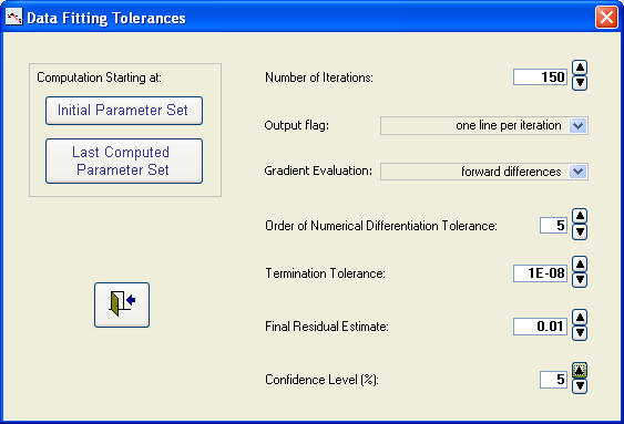 Parameters, tolerances and start of a data fitting run:
